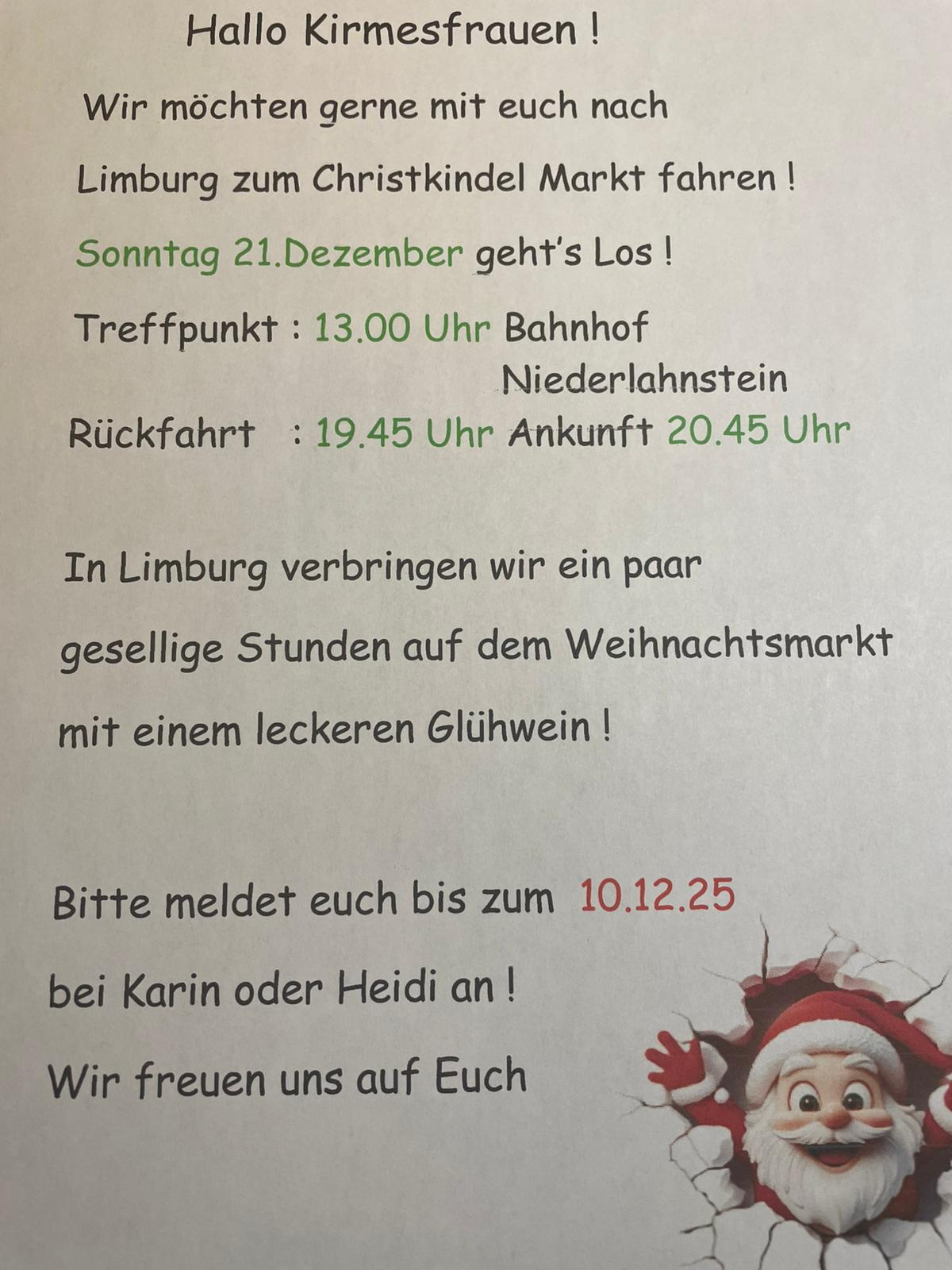 Die Abschlussfahrt der Kirmesfrauen führt uns wieder auf den Christkindelsmarkt. Wer mitfahren möchte, schnell sein und bei Karin oder Heidi anmelden!