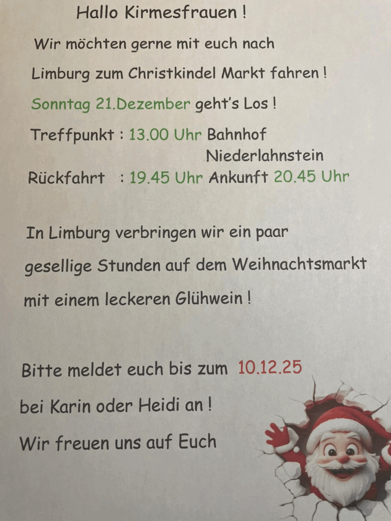 Die traditionelle Fahrt der Kirmesfrauen steht ebenso bevor, wie das einläuten des neuen Jahres mit dem Neujahrs-Brunch. Weitere Informationen findet ihr in den beiden angehängten Dateien. Meldet euch wie üblich bei Heidi oder Karin an.